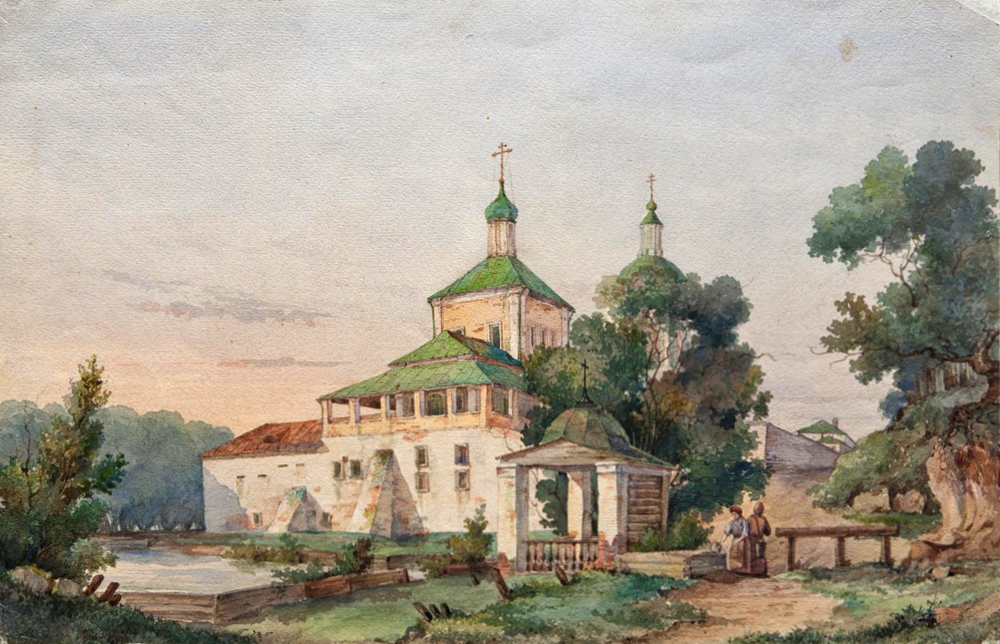 Акварель "Андреевский монастырь на Воробьевых горах". Неизвестный художник. 1850-е годы.