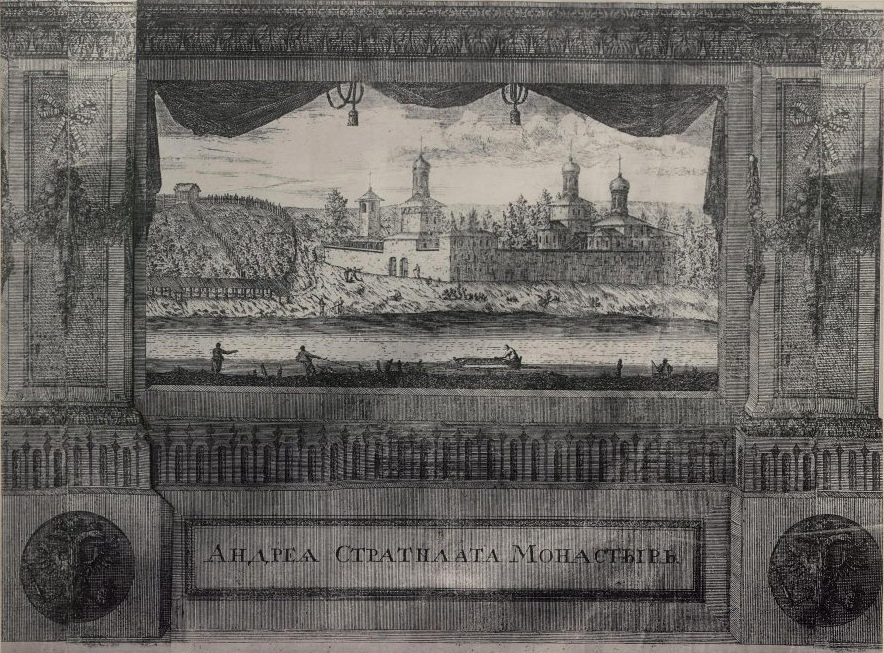 Достаточно детализированное изображение строений Андреевского монастыря содержится на гравюре «Андреа Стратилата монастырь», сопровождающей в числе видов прочих обителей панораму Москвы «Вид с Каменным мостом из Замоскворечья» в издании, подготовленном в 1701–1708 годах П. Пикартом при участии Я. Бликланда. Гравюра изображает монастырь в том облике, который он приобрел в третьей четверти XVII века, в пору своего кратковременного расцвета. Представленный вид на монастырь — с северо-востока, из-за Москвы-реки, с противоположного (левого) берега. Такой ракурс позволил художнику показать комплекс в наиболее выгодном для его обозрения развороте и так скомпоновать изображение на заданном поле гравюрного клейма, чтобы по возможности охватить наиболее важное в окружении ансамбля.
