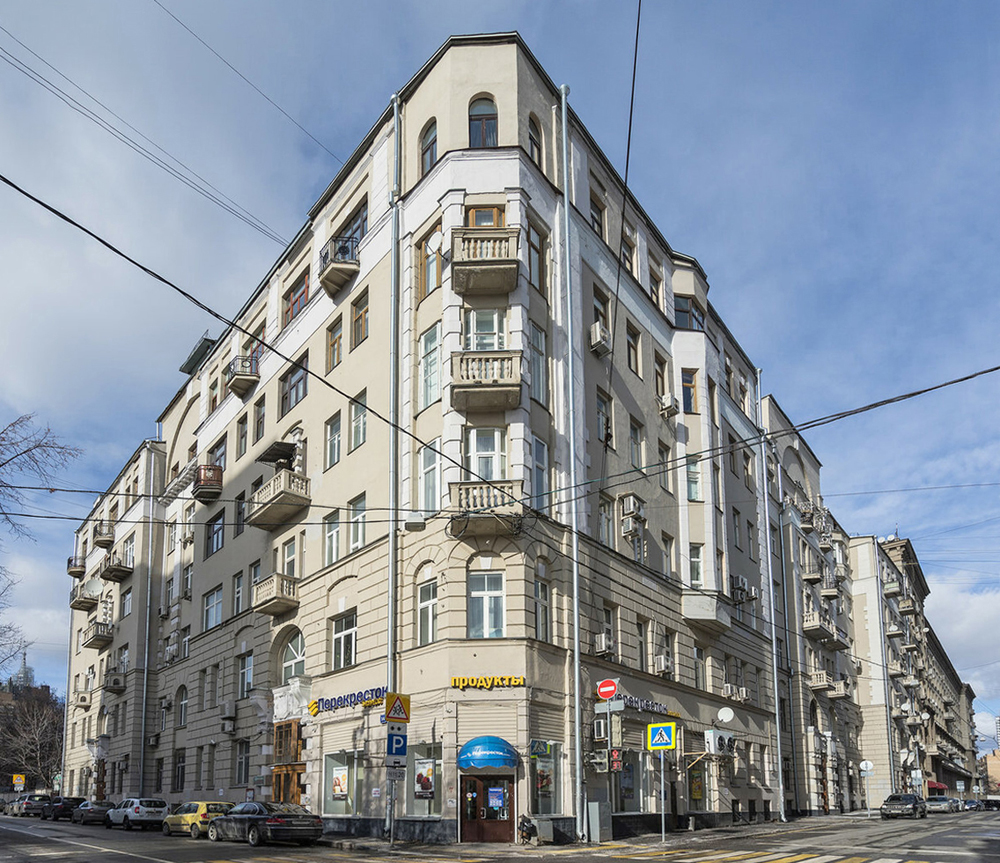 Вплотную к нему примыкает жилой дом №19 — уже 1930-х годов постройки. Темный протяженный фасад хорошо связан со старым зданием, о котором шла речь. Обратите внимание, как это достигнуто, — некоторые детали и даже фрагменты на фасаде нового здания сходны с теми, что формируют облик дома постройки 1914-го, — общие горизонтальные членения, балконы, карнизы…