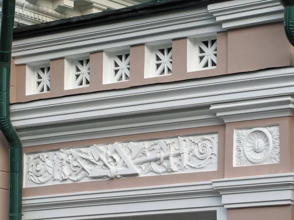Дом Фалеева. Масонская символика на фасаде. В действительности же она говорит о принадлежности владельца и строителя особняка к сообществу гражданских инженеров России. У сообщества в эмблеме были те же предметы: треугольник, кирка, циркуль, топорик.
