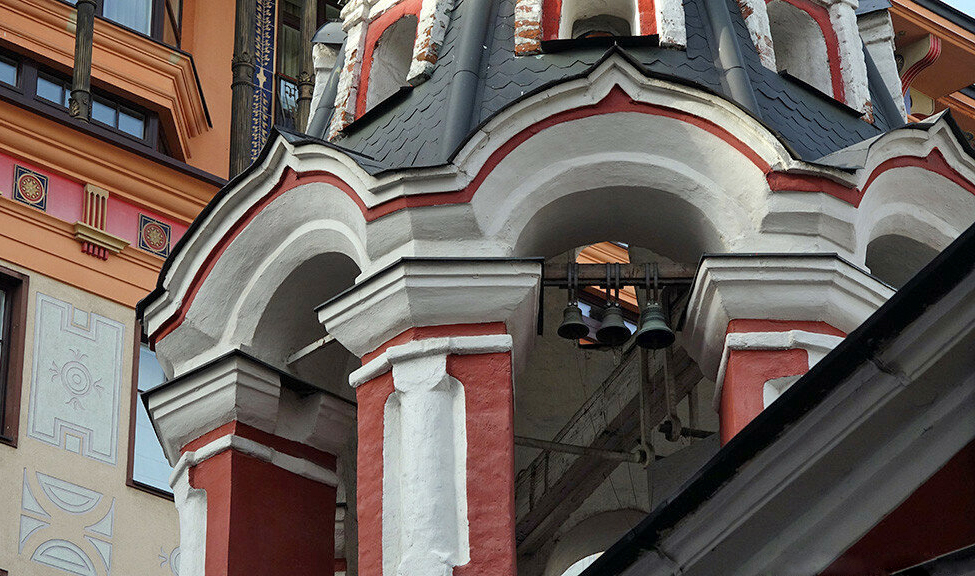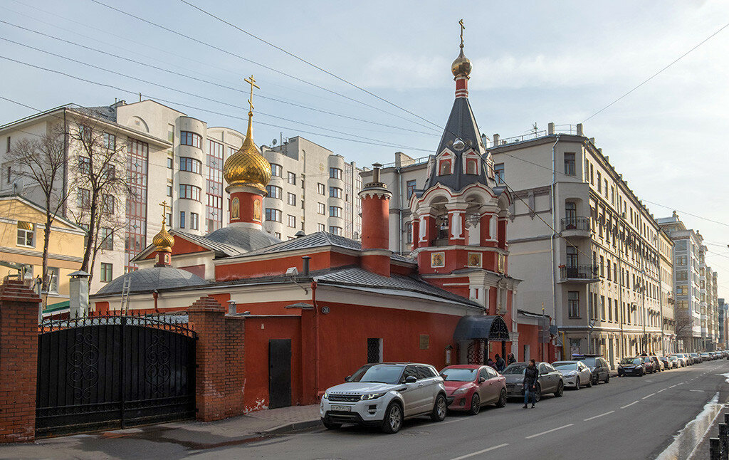 Плотно обжатая с двух сторон высокими домами, она как бы втиснулась в небольшое пространство, но не утратила достоинства. «1688 г.» — значится на охранной доске. Не так уж и стара эта церковь — есть в Москве и древнее, а смотрится на добрых сто лет старше.