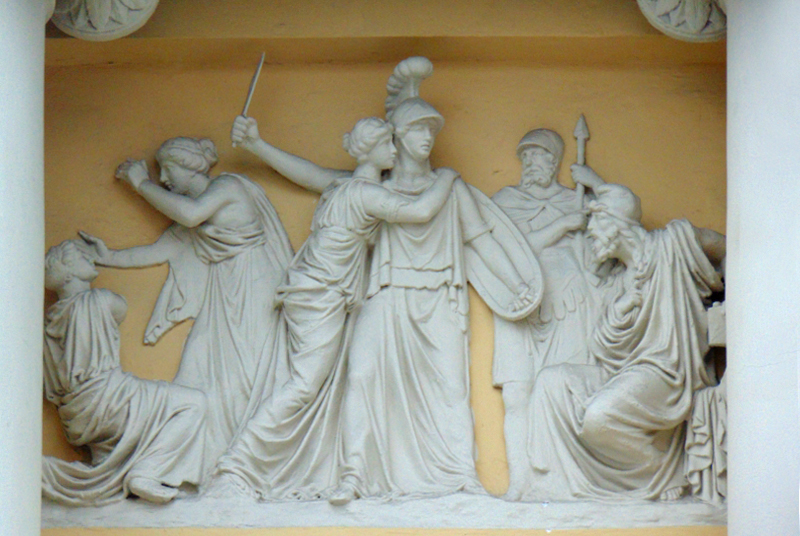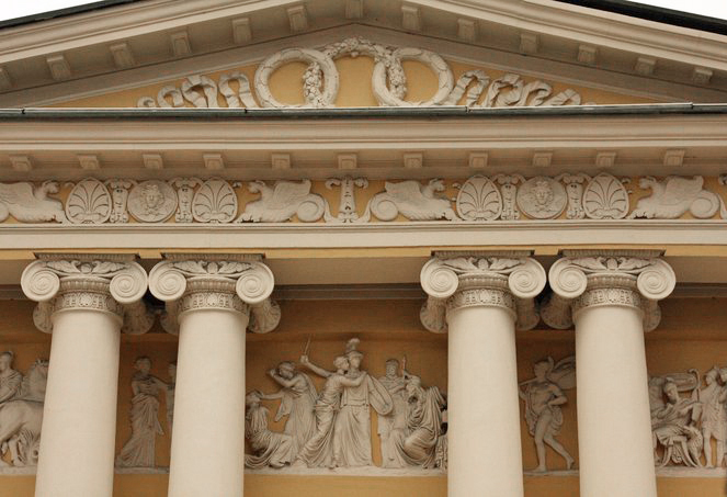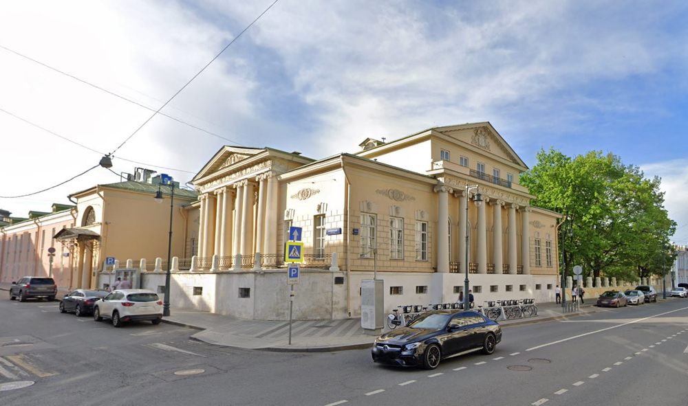 Лучше всего здание воспринимается от угла Пречистенки и Всеволожского переулка. Случайно ли? Судя по тому, что зодчий сделал два почти равных по значению фасада — в переулок и на улицу, — особенностям восприятия здания он уделил специальное внимание. Если на главную улицу ориентирован шестиколонный портик ионического ордера, то в сторону переулка обращен не менее торжественный портик из восьми колонн. Здесь ионические колонны сгруппированы попарно и подняты на высокую каменную террасу. За колоннами большой сюжетный фриз работы выдающегося скульптора И. П. Витали.