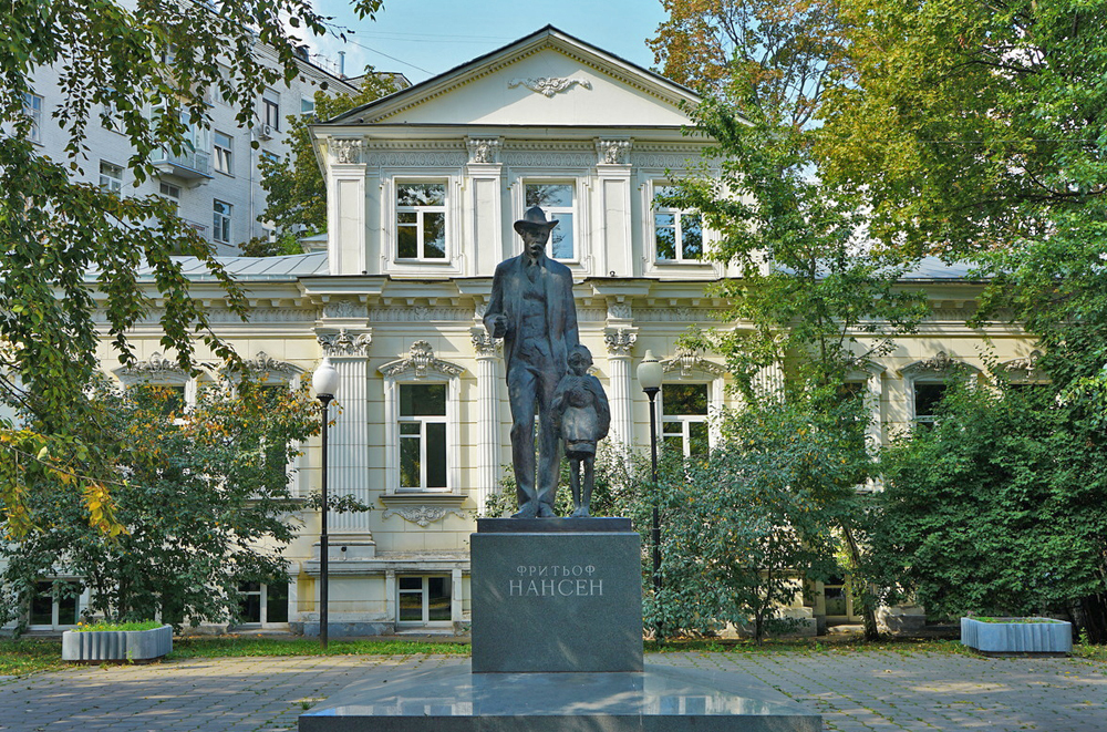 Усадьба Сабашниковых в Большом Левшинском переулке и памятник Фритьофу Нансену перед ней.