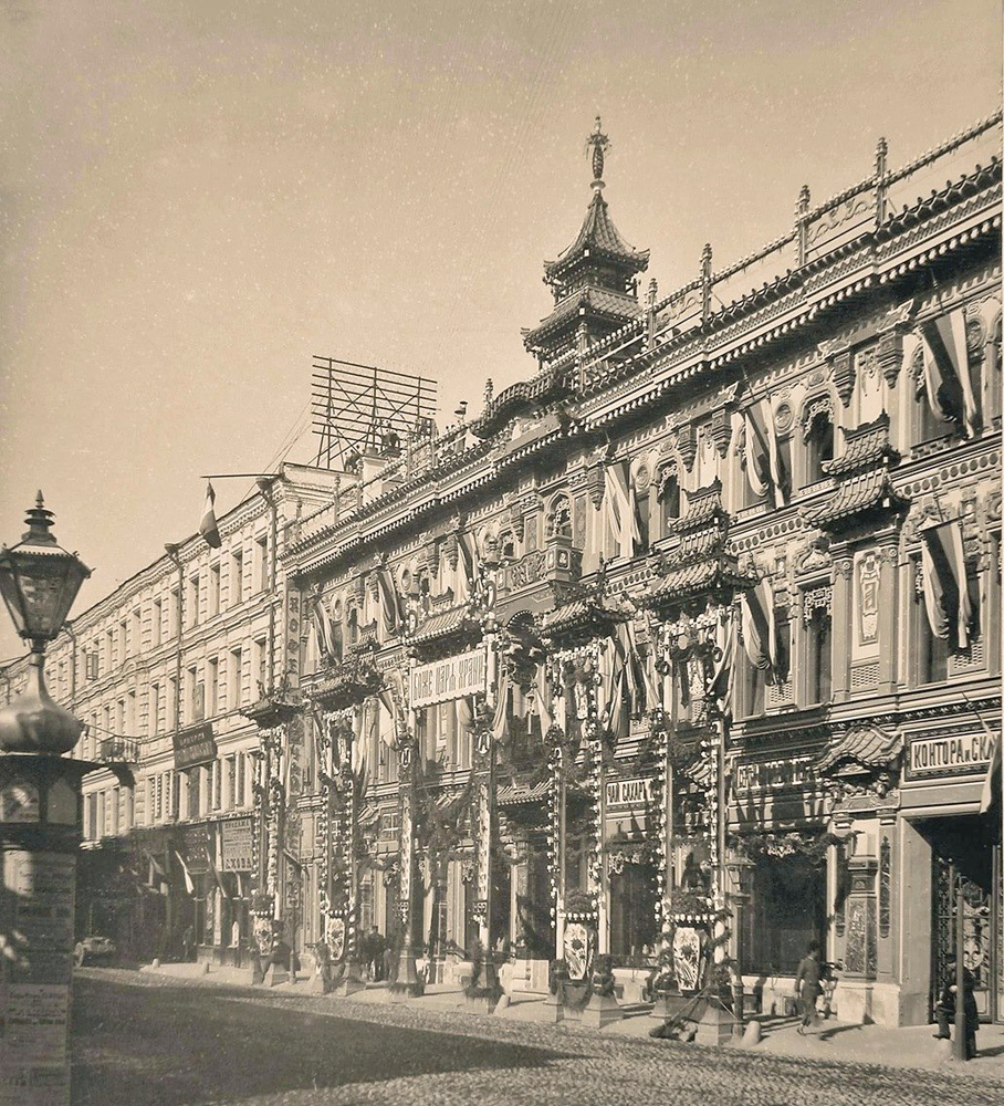 Вид празднично украшенного и иллюминированного к торжествам коронации дома С.В. Перлова на Мясницкой улице. Фотография 1896 года.