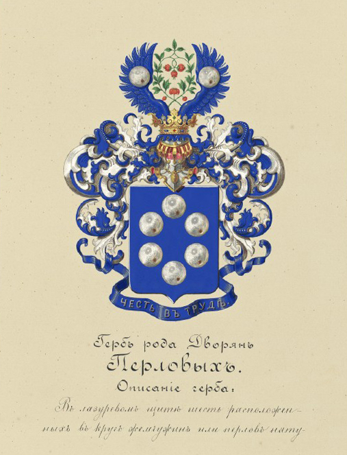 В России существовала традиция в честь столетия какой-либо торгово-промышленной компании присваивать ее представителям дворянское звание. Высочайшим указом от 6 февраля 1887 года Перловы получили дворянство "во внимание к 100-летней деятельности их рода" и герб: "В лазоревом щите шесть расположенных вкруг жемчужин или перлов натурального цвета. Щит увенчан дворянским коронованным шлемом. Нашлемник – чайный куст с шестью цветками... Намет – лазоревый с серебром. Девиз "Честь в труде" – серебряными буквами на лазоревом щите".