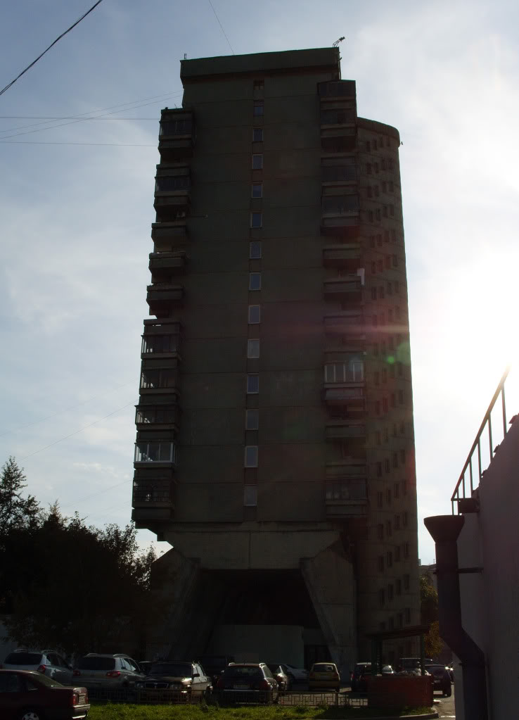 Это жилой дом, расположенный по адресу улица Беговая 34. Построен арх. Меерсоном и его коллегами в канун Олимпиады-80 в стиле брутализма. Тринадцать этажей покоятся на стройных и мощных железобетонных опорах. Их особенность в том, что они сужаются к основанию. За счет сужающихся опор дом кажется совсем ненадежным, однако, это не так. Оторван дом от земли не для красоты и не для того, чтобы проверить нервы жильцов. Просто он стоит на одной из важнейших улиц города с интенсивным движением, и, дабы не скапливались выхлопные газы, его решили приподнять. Своеобразная форточка позволяет воздуху свободно циркулировать и быстро обновляться. А пространство под зданием используют для автостоянки. Сами жители называют свой дом "избушкой на курьих ножках", а из-за обилия поддерживающих опор, напоминающих щупальца, москвичи прозвали его "домом-осьминогом".