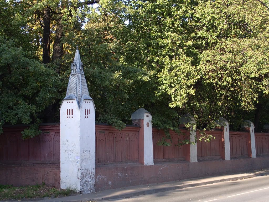 Одним из пациентов лечебницы был художник Михаил Врубель. Находясь в клинике, он написал несколько картин, в том числе и свою последнюю в жизни работу – портрет Брюсова. По эскизам Врубеля в 1910 году Шехтелем создана ограда лечебницы и ее ворота, которые теперь часто называют Сказочными. Кстати, существует мнение, что Сказочные ворота «трансформировались» из ворот дачи Ивана Морозова, которая ранее там находилась. » Деревянные пролеты ограды украшены глухой резьбой. И раньше столбы ограды были украшены майоликами, сейчас же ограда находится в довольно плачевном состоянии, разрушается, особенно боковые башенки.