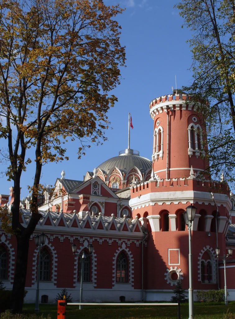 Построен он был в 1770-х гг на землях Высокопетровского монатыря, архитектором Матвеем Казаковым, по распоряжению Екатерины Великой. М.Ф. Казаков умело сочетал белый камень и красный кирпич. Получилось легкое, почти ажурное строение, в котором сочетаются приемы русской неоготической архитектуры, «турецкого» стиля , сам дворец представлял собой подобие крепости - он был окружен мощными стенами с тосканскими башнями-джонками. Петровскому дворцу более 200 лет, но и сейчас он радует душу и глаз. Во времена первой мировой войны там находится госпиталь, в 20-е годы дворец передали Военно–воздушной инженерной академии имеми Жуковского. Принято считать, что Петровскому дворцу академия только повредила. В 97-м году Петровский путевой дворец у академии забрали. Сейчас это Дом приемов правительства Москвы.