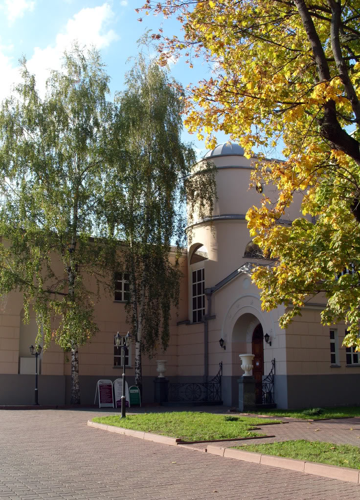 Лицевое здание конюшен - это странное сочетание типичнык колонн барокко, тяжеловесного герба с грубыми раковинами и вензелем владельца - "ЛМ", прекрасной высокой арки с чугунной решеткой и очаровательной башенки с флюгером-лошадкой. Вокруг башенки есть галлерейка с полуразрушенным ограждением. Театр, которому здание отдали на растерзание, разрушил боковые корпуса лицевого здания, внутренние помещения конюшен, воздвиг там какие-то металлические конструкции, но с 1999 года так ничего толком и не построил.