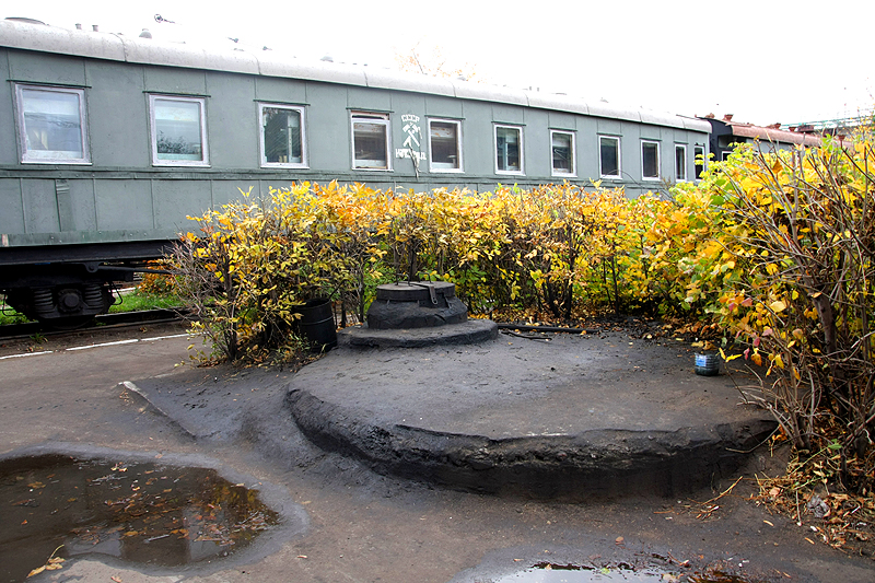 А это уже действующая гидравлическая колонка на основе колонки 1930-х годов. Во время экскурсий из нее заправляют водой ретропаровоз. Если присмотреться, то внизу ее можно увидеть небольшой металлический ящик, это печка, которой отапливают колонку зимой, чтобы предотвратить ее замерзание, дым из печки выходит через отверстия вверху черного основания колонки.