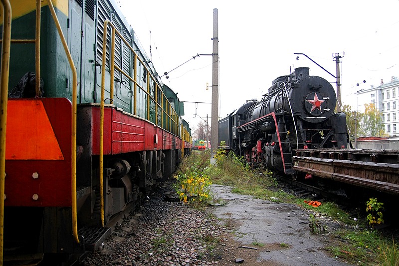 Среди обычных тепловозов на станции стоят старые паровозы, в основном так называемые Эрки и Лебедянки. Правая Лебедянка стоит без движения - у нее треснул котел, ее, бедолагу, уже стали постепенно разбирать.
