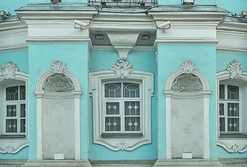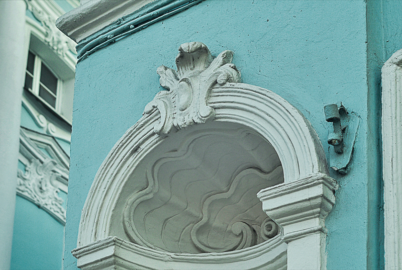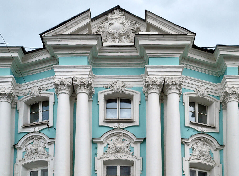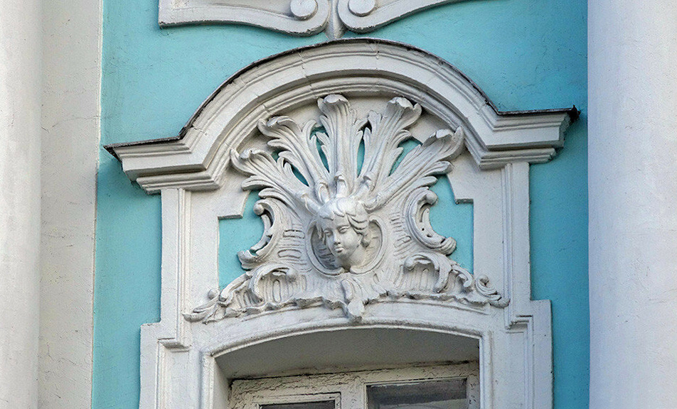 На бледно-лазоревом фоне стены расцветают сложные белые наличники; белые тяги венчающего карниза и междуэтажного пояса широкими лентами связывают в единую композицию горизонтальные и вертикальные элементы декора. Коринфские колонны на высоких, во весь первый этаж, пьедесталах создают сложный, пульсирующий ритм. А сами пьедесталы украшены полукруглыми нишами и филенками. Декор фасада настолько насыщен, так многообразен, что не сразу замечаешь — отдельные его участки, оказывается, повернуты к основной плоскости под небольшим углом. Это отчетливо видно при взгляде на сложный венчающий карниз, который рисует на фоне неба нервную, изломанную линию.
