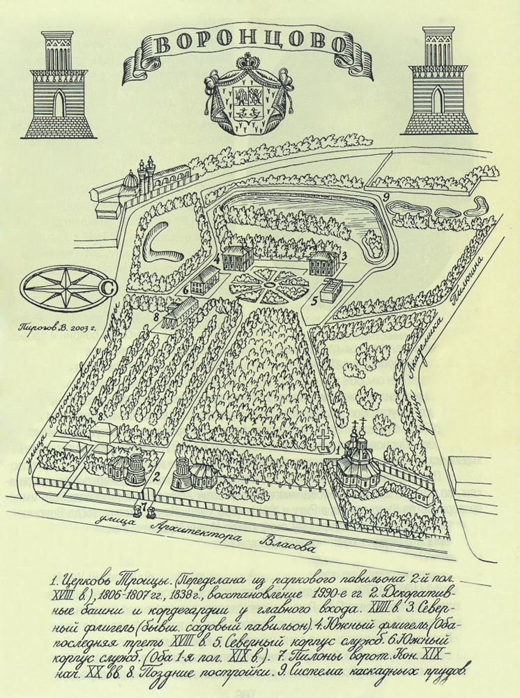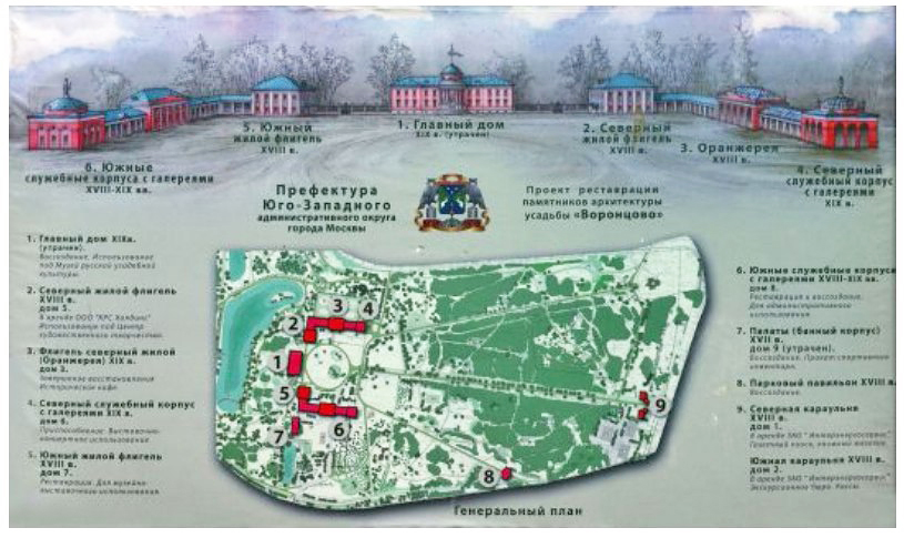 Проект реставрации усадьбы Воронцово 2011 года. Внешний вид главных построек и генеральный план поместья.