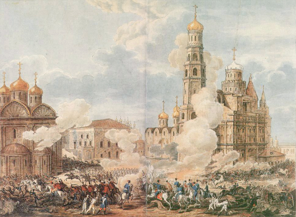 Как известно, покидая Москву утром седьмого октября, император приказал маршалу Мортье, военному губернатору города, уничтожить национальную русскую святыню – заминировать и взорвать Кремль. Однако появление русских и проливной дождь, погасивший часть фитилей, спасли от разрушения большинство зданий древней крепости. Кремль был взорван с четырех сторон. В результате обрушились Водовзводная, Петровская и Первая Безымянная башни. Сильно пострадали Никольские ворота и Угловая Арсенальная башня. Рухнули северное крыло Арсенала, Петрокова и Филаретова звонницы. В столпе колокольни Ивана Великого появились вертикальные трещины. Обгорели Грановитая палата и Кремлевский дворец. Н.М. Шатров в стихотворении "Пожар Москвы в 1812 году" писал: "Все истребилось, и сожглися Гостиный двор и Арсенал, сам Кремль с Китай сотряслися и сам царь-колокол упал, взорвались башни, сокрушились, зубчаты стены развалились, скатилися с бойниц главы. Повсюду ужас, разрушенье. Пять взрывов – и в одно мгновенье не стало на земле Москвы".
