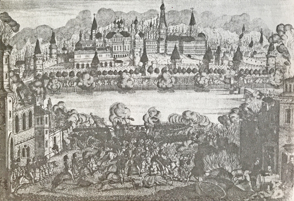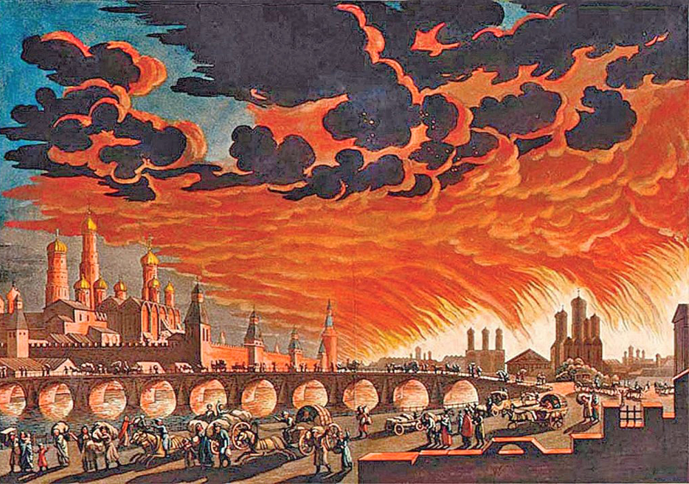 Гравюра-лубок неизвестного автора. Вид Кремля из-за Москвы-реки во время пожаров в сентябре 1812 года.