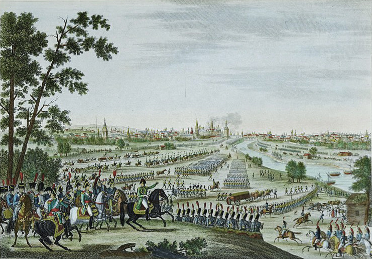 В некоторых случаях французские мастера были более самостоятельны, но все же в значительной степени находились под воздействием сложившегося еще в конце XVII века стереотипного представления о Москве как о средневековом городе, окруженном крепостными укреплениями, со множеством башен, церквей и колоколен. В 1815 году Ф.-Л. Куше-сын, автор известной гравированной серии "Битвы империи", выполнил гравюру, на которой было показано вступление в Москву французов. По словам французского офицера Ц. Ложье, перед ними открылась удивительная картина. "Прекрасная столица под лучами яркого солнца горела тысячами цветов: группы золоченых куполов, высокие колокольни, невиданные памятники". Трудно было представить, что уже вечером этого дня в городе, в котором из 200 тысяч осталось всего около 10 тысяч жителей, начнутся первые пожары. На первом плане гравюры Куше изображен император Наполеон, наблюдавший с Поклонной горы за основными частями своей армии, которые тремя маршевыми колоннами входили в древнюю столицу через Тверскую, Дорогомиловскую и Калужскую заставы. По изобразительному решению гравюра несколько напоминает панорамные виды Москвы с Воробьевых гор конца XVII – начала XVIII века, показывавших весь город как бы с высоты птичьего полета.