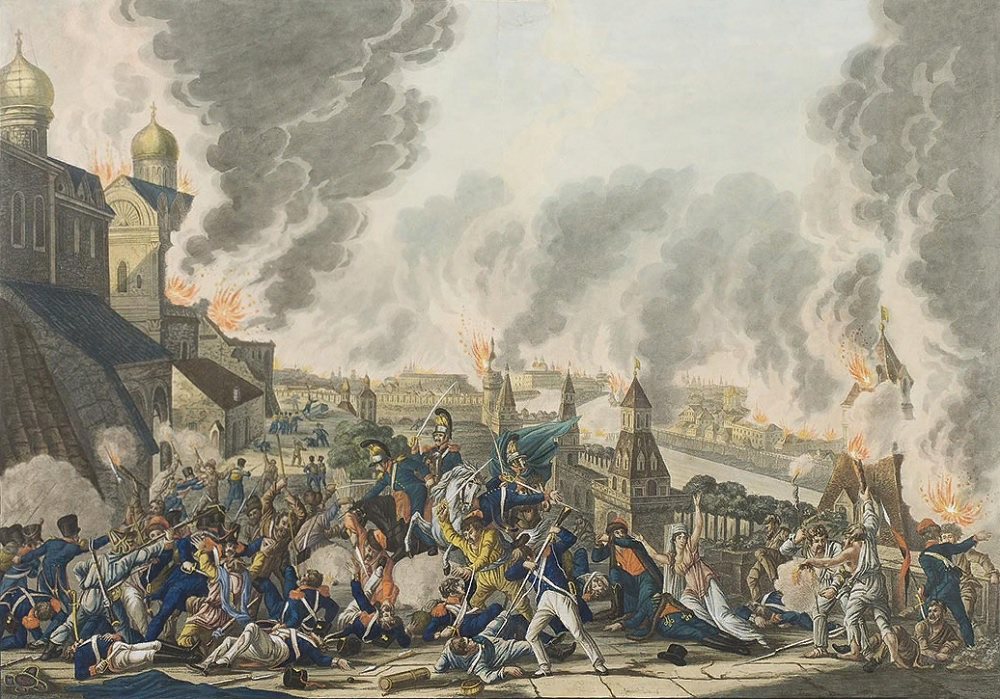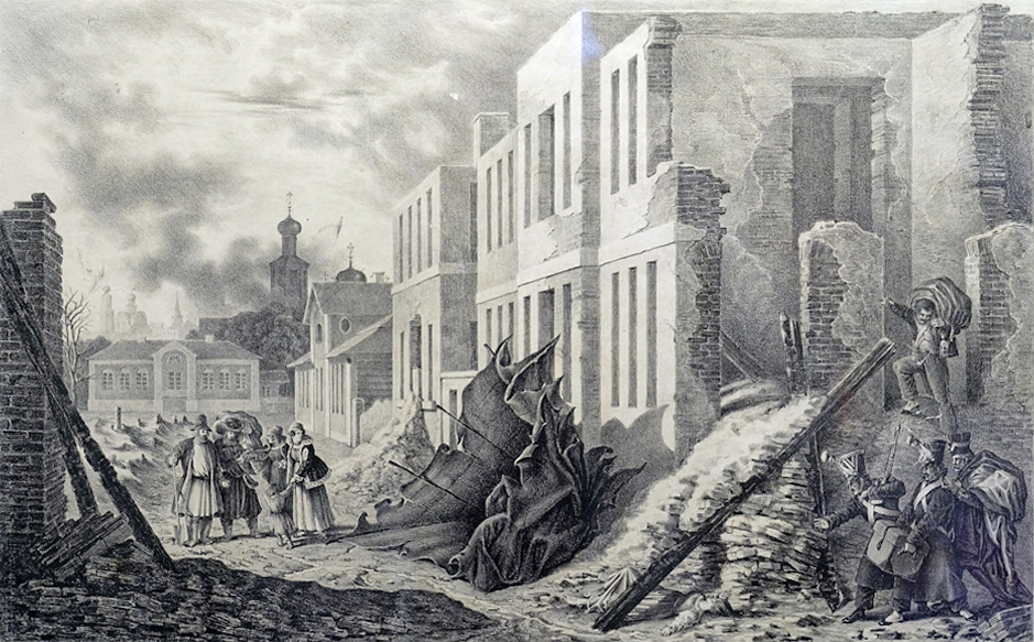 Литография А.Адама "Вид Москвы 22 сентября 1812 года. Мародерство французов в Москве".