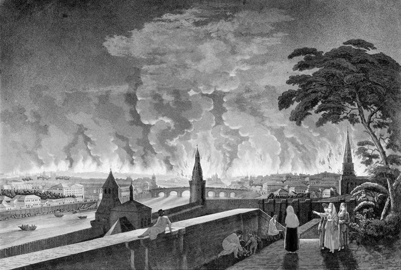 Гравюра И. Ругендаса "Пожар Москвы 15 (3) сентября 1812 года. Вид из Кремля в сторону Воспитательного дома".