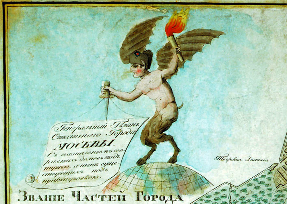 Фрагмент Генерального плана столичного города Москвы 1813 года. Наполеон изображен в виде черта с крыльями и копытами.