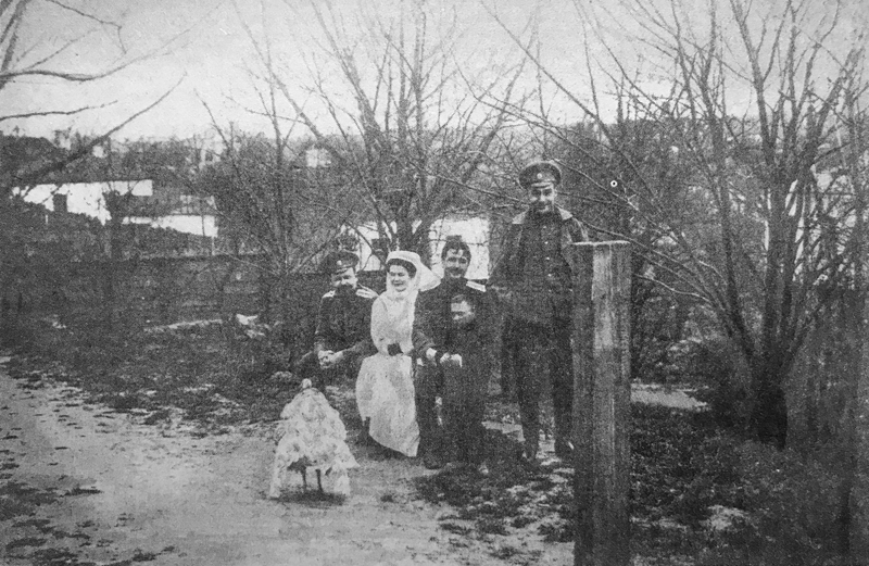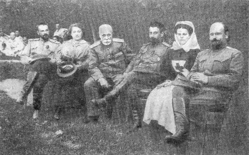 На театре военных действий Первой мировой войны. Сестра иверской общины Анастасия Турлевич (в центре), хирург общины Алексей Николаевич Кулаков (слева), заведующий терапевтическим отделением Авксентий Христофорович Бабасинов и хирург Андрей Андреевич Андреев (справа). Рядом с врачами - санитар из местных жителей. Винница. Фотография 1915 года.