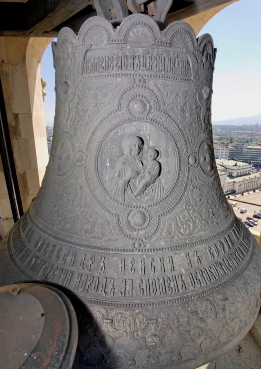 Собор Александра Невского в Софии (Болгария). Украшающий его звонницу колокол завода П.Н. Финляндского очень необычен по дизайну: его плечи выступают вверх подобно закомарам. Фотография И.М. Дроздихина. 2010-2020 гг.