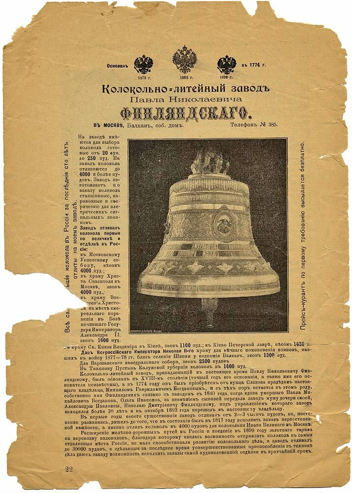 Но высшей отметкой заслуг было получение права герба, то есть позволение изображать герб России на своих изделиях. Завод П.Н. Финляндского получал это право на Всероссийских выставках трижды: в 1873 году в Москве, в 1882-м также в Москве и в 1896 году в Нижнем Новгороде. Во всех рекламных объявлениях этого завода можно прочесть: "Завод отливает колокола, первые по величине и отделке в России".