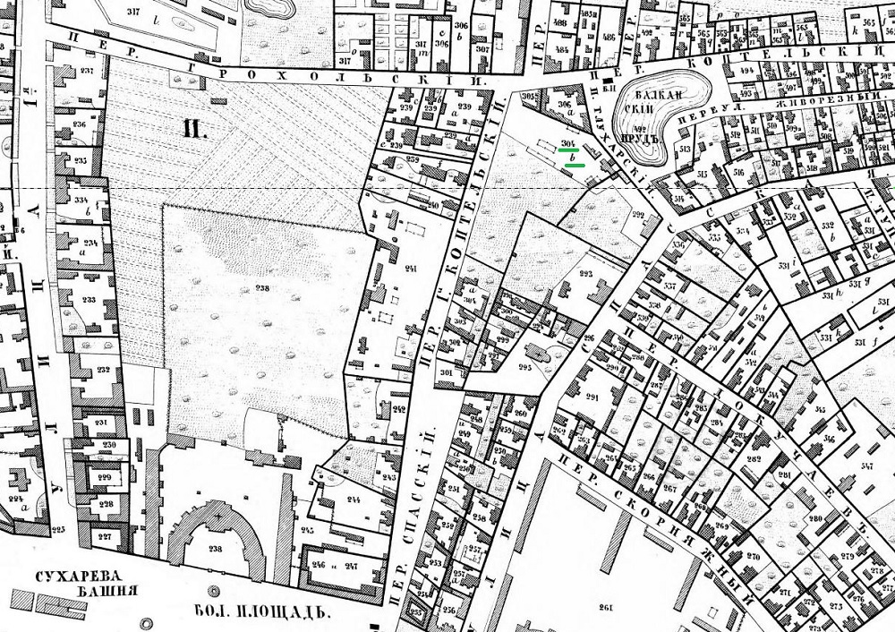 Территория колокололитейного завода М.Г. Богданова (в будущем - завод П.Н. Финляндского, правнука М.Г. Богданова) на Хотевском плане Москвы 1852 года. Участок, принадлежащий Богданову, пронумерован как 304b (отмечен зеленым), находился рядом с Балканским прудом.