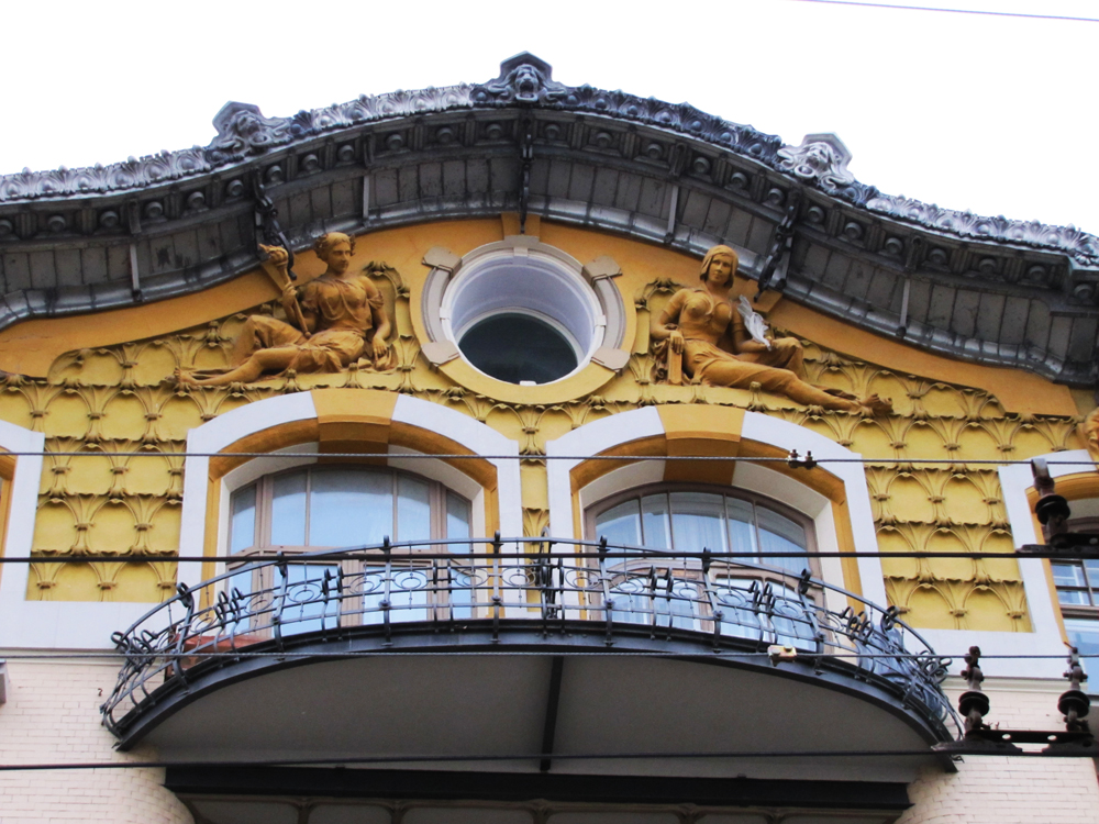 Отличительной чертой архитектуры дома можно назвать асимметрию плана постройки, обусловленную конфигурацией участка: задняя часть здания, выходящая во двор, имеет 6 этажей, а парадная, выходящая на улицу, - 5. Безусловно, выделяется и выполненный на высоком художественном уровне декор здания. Здесь огромное количество как мелких, так и крупных элементов декорирования: изящные рисунки переплетов разнообразной формы и размеров окон, легкая и воздушная ажурная ковка решеток балконов, выступающие по краям здания эркеры, большое слуховое окно в центре, под изгибом сильно выступающего карниза, лепная кружевная сетка фриза верхнего этажа, скульптурные изображения двух женских фигур с факелом и книгой в руках – аллегории знания и просвещения. Декор дома распределен так, что с каждым этажом он становится все богаче, достигая пика наверху. Кстати, изначально волнообразную форму карниза подчеркивала еще и не сохранившаяся до нашего времени статуя, стоявшая на крыше. В украшении здания архитектор использовал основные приемы модерна, соединив их с необарочным декором, что характерно для французской разновидности модерна – ар-нуво.