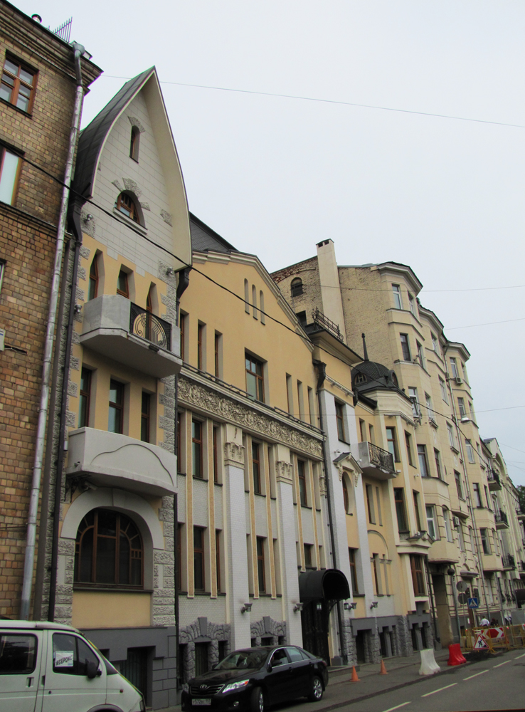 Владельцем земли, на которых сейчас расположены дома №6, 8 и 10 по Пречистенскому переулку, в XVIII веке был князь И.А. Гагарин, однако его обширная усадьба, раскинувшаяся на этом участке, подобно многим домам той поры, сильно пострадала в пожаре 1812 года и не сохранилась до нашего времени. В 1899 году владение Гагарина приобрело только что образованное Московское Торгово-строительное Общество для возведения на этом месте трех частных домов. Деятельность этого строительного общества чрезвычайно важна и показательна для характера застройки Москвы рубежа XIX-XX веков. Целью общества было сооружение с привлечением молодых талантливых архитекторов роскошных особняков «под ключ» с последующей их перепродажей состоятельным людям. Застройка приобретенного обществом владения в Пречистенском переулке задумывалась организаторами в качестве своего рода выставки «образцовых» вилл в новом стиле, особняки, построенные здесь, были своеобразными экспонатами, демонстрирующими возможности стиля модерн, причем выполнены они были в совершенно разных, не похожих друг на друга направлениях модерна.