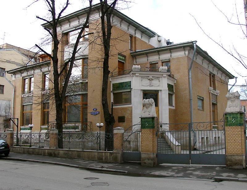 Автором проекта дома по адресу Пречистенский (Мертвый) переулок, 10 стал архитектор Вильям Валькотт, уроженец Одессы, происходивший из шотландско-русской семьи. Эта постройка зодчего является первым примером московской виллы в стиле «чистого» модерна. Дом выполнен в рациональном, немного чопорном стиле шотландского модерна. Валькотт построил это здание, будучи вдохновлен творчеством известного архитектора из Глазго Чарльза Макинтоша. Работы Макинтоша отличались простотой форм, обширным остеклением и практически полным отсутствием декора, вот и в этом доме, построенном Валькоттом, прослеживаются эти же черты: прямоугольные строгие очертания, трапециевидные, не сильно выступающие эркеры, большие окна с тонкими переплетами, плоская крыша. Единственная черта, все же привнесенная русским характером, любовью к самовыражению через внешнюю эффектность, - это чуть более разнообразное декорирование: кованые решетки балконов и ограды, кронштейны, поддерживающие крышу, миниатюрные лепные розетки, майоликовые панно зелено-коричневой гаммы с цветочным рисунком, удачно гармонирующие с мягким желто-оранжевым цветом облицовочного кирпича стен, и визитная карточка Валькотта – женская головка, обрамленная роскошными, причудливо вьющимися локонами, - нимфа Лорелея. Выделяются в декоре также завершения пилонов въездных ворот, облицованные зеленой керамикой и увенчанные скульптурами женских головок.