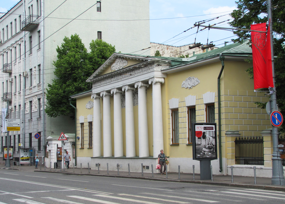 Так называемая усадьба Охотникова, построенная на грани XVIII—XIX вв, затем, после пожара 1812 года, реконструированная. Первоначально на этом месте находилась деревянная усадьба Талызиных. В 1808 году офицер и дворянин Павел Яковлевич Охотников, пожелавший перебраться на жительство в Москву, приобрел усадьбу у жены генерал-поручика Талызина и даже занялся ее перестройкой, однако, наверное, к счастью, сделано им было не много. К счастью потому, что в 1812 году случился всеобщий московский пожар, не пощадивший и дома на Пречистенке, в том числе и приобретенную Охотниковым усадьбу.
