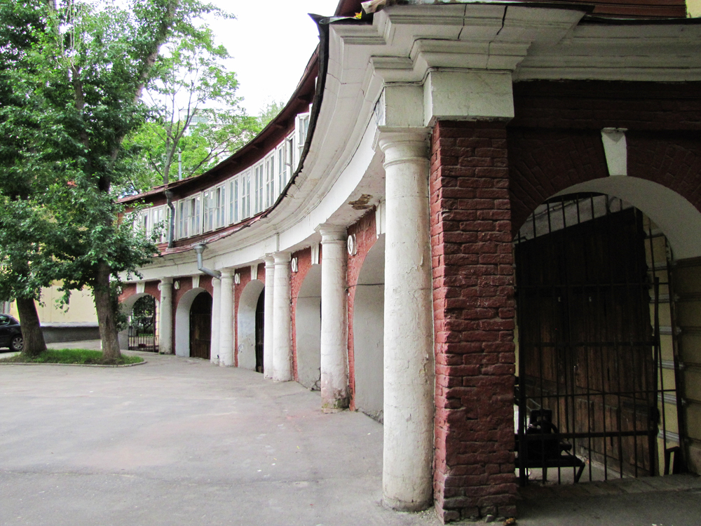 Двор замкнут двумя исключительно живописными полукруглыми двухэтажными строениями, образующими собой так называемую циркумференцию, верхние этажи их построены в дереве, а нижние представляют собой открытые аркады на белокаменных колоннах. Это бывшие конюшни усадьбы. Широкие проемы арок в нижнем этаже нужны как раз для въезда внутрь саней и карет. Между конюшнями притулился невзрачный двухэтажный домик, в котором сейчас почти невозможно узнать бывшую домовую церковь усадьбы. Такие небольшие церквушки на территории своих усадеб часто строили для себя лично богатые горожане.