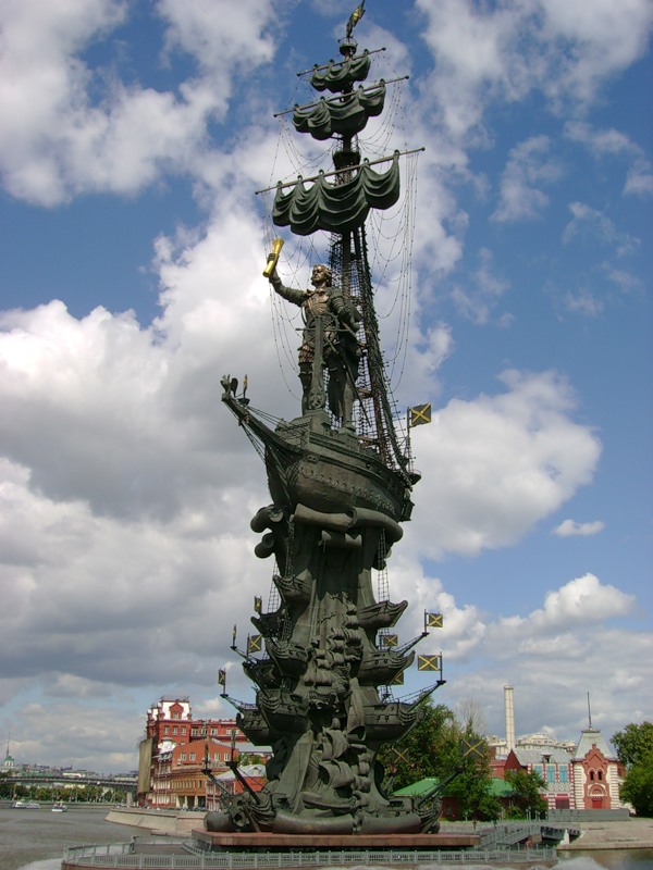 Это монументальное сооружение, высота которого составляет 98 метров. Памятник Петру I - самый высокий в России и один из самых высоких в мире. Конструкция представляет собой колонну, на которой находится скульптурное изображение парусного корабля, на палубе которого воздвигнута большая скульптура Петра I. Автор памятника - Зураб Церетели. Выполнено сооружение из бронзы высочайшего качества, свиток, который держит в руках Петр I и Андреевские кресты на флагах позолочены. Не менее, чем своими достоинствами, памятник Петру I Зураба Церетели известен неточностью в символике композиции. Постамент памятника украшают ростры-носовые части кораблей. Со времен Древнеримской империи демонстрация носовых частей вражеских кораблей означала победу над чужим флотом. А на носовых частях кораблей, расположенных на постаменте, - Андреевские флаги, по сложившейся символике такая композиция читается, как победа Петра I над своим же флотом, что является полной нелепостью. Хотя, и это досадное недоразумение уже стало частью достопримечательности.