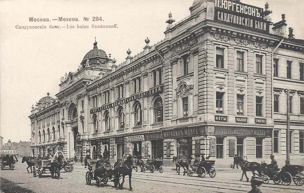 Первые бани актера Сандунова и жилые дома его семьи располагались недалеко от Петровского театра Медокса (сейчас на его месте Большой театр), на берегу реки Неглинной.