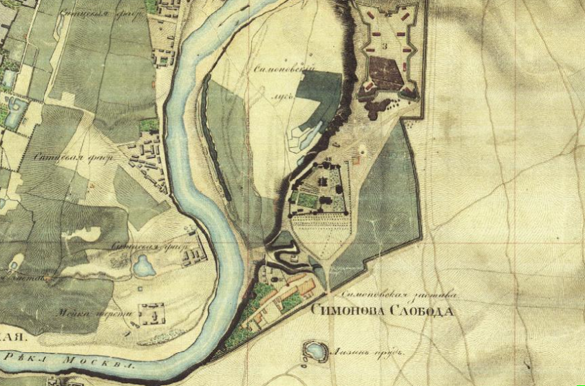 Вид Симонова монастыря близ Москвы. Акварель неизвестного художника. Сергиев (Лизин) пруд — слева.