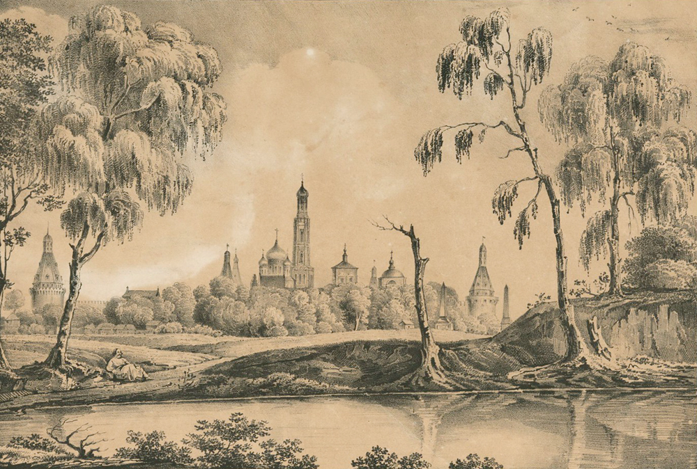 Вид Симонова от Сергиевского пруда. Литография 1843 года. Автор — К. Рабус.