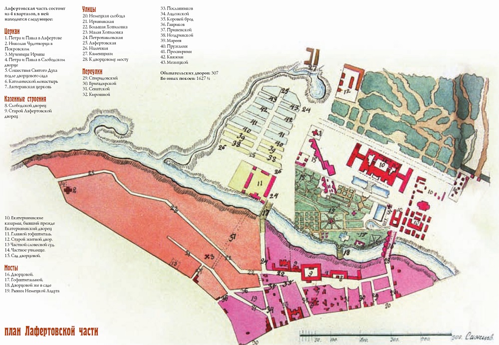 Франц Лефорт писал в одном из писем к брату: «У меня самое лучшее место в Слободе, перед моим садом протекает прекрасная река, а с другой стороны я велел построить деревню из 500 домов для моих солдат… Я также повелел построить там беседку, поскольку его величество большой любитель солдат, и он часто приезжает смотреть на учение моего полка».