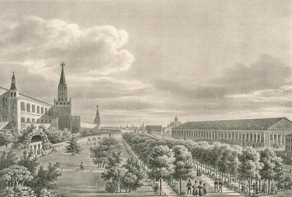 Еще в конце XVIII века известный французский художник Ж. Делабарт выполнил виды из Кремля (с балкона императорского дворца) которые с тех пор прочно вошли в иконографию Москвы. В 1820-х годах в ее графической летописи появилась новая тема, отразившая преобразования древнего центра города в результате усилий Комиссии для строений и ее главного архитектора О.И. Бове.