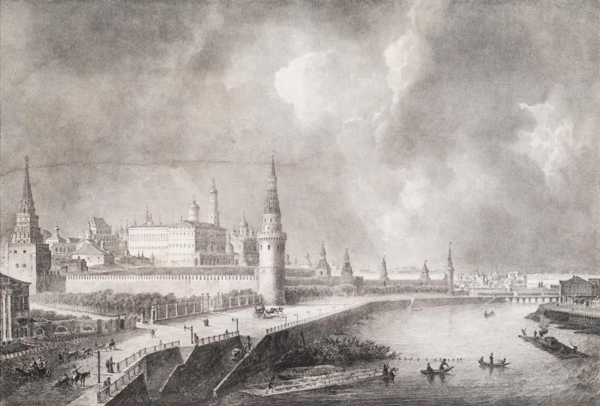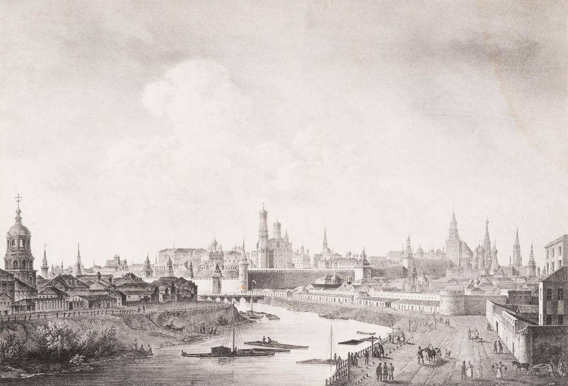 Общий вид Кремля со стороны Яузы. Литография О.Ф. Леметра по рисунку О. Кадоля. Издательство Г. Энгельмана. 1825 год.