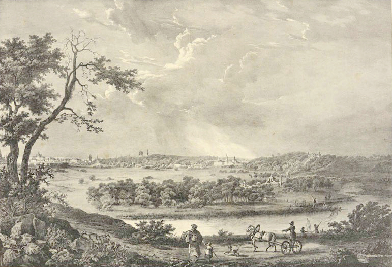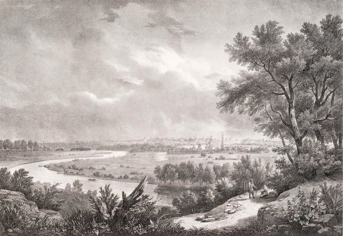Вид части Москвы и ее окрестностей с Воробьевых гор. Литография Ж. Жакотте по рисунку О. Кадоля. Издательство Г. Энгельмана. 1825 год.