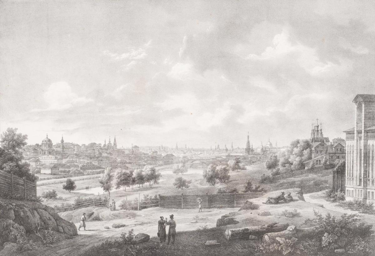 Общий вид Москвы с Воробьевых гор. Литография И.Л. Деруа по рисунку О. Кадоля. Издательство Г. Энгельмана. 1825 год.