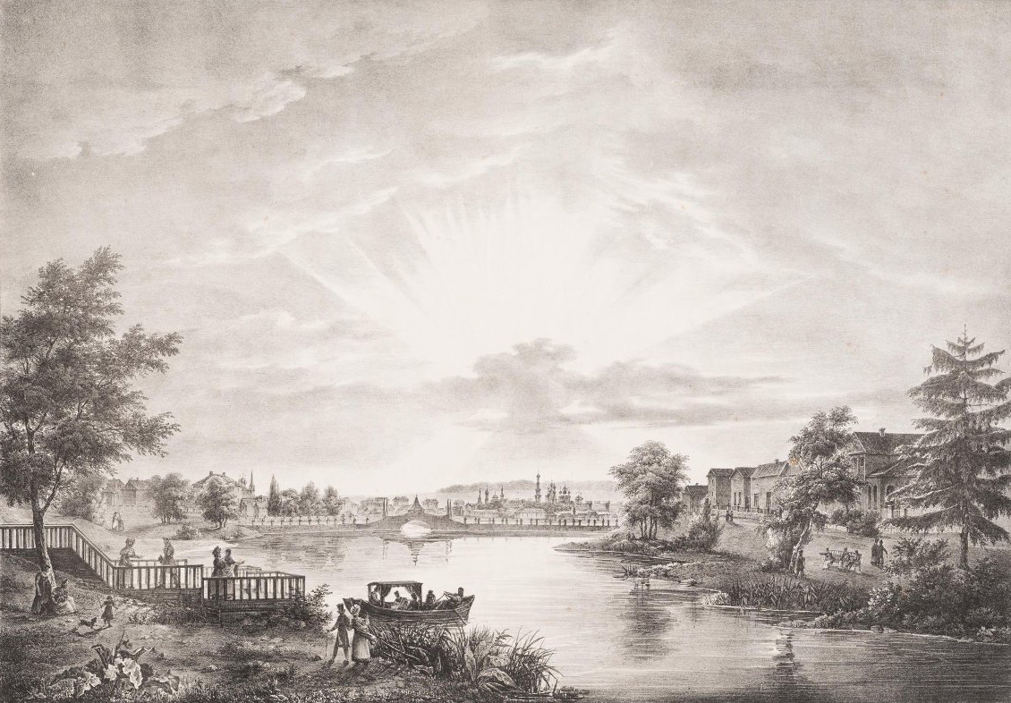 Вид Пресненских прудов. в Москве. Литография О.Ф. Леметра по рисунку О. Кадоля. Издательство Г. Энгельмана. 1825 год.