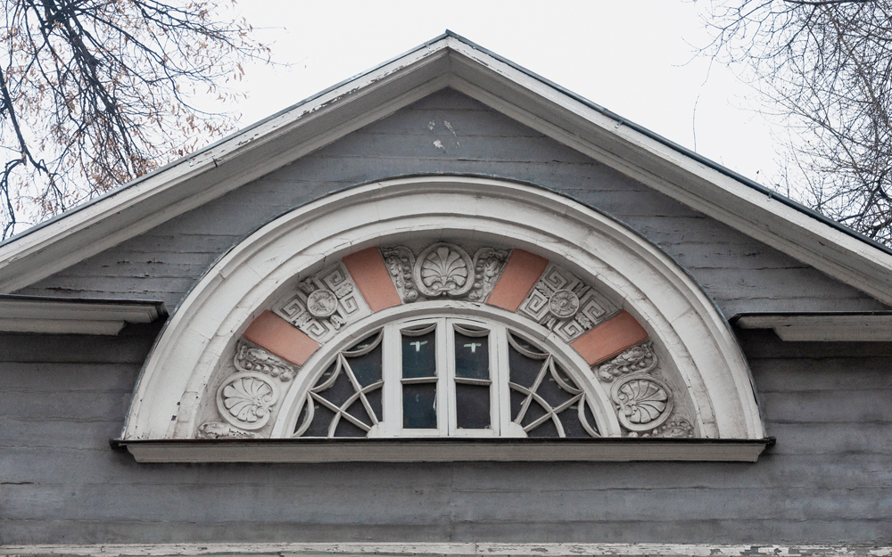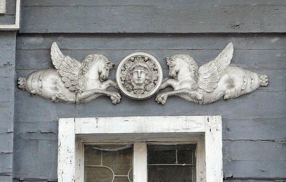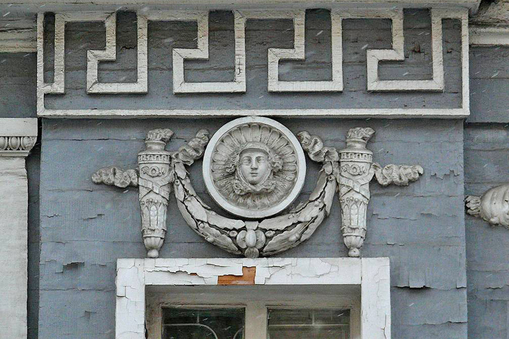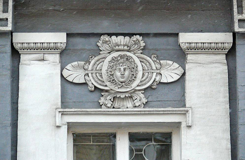 Лепное оформление фасада дома Полибина. Пилястры и медальон, украшенный пальметтами.