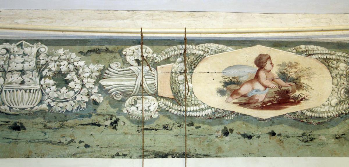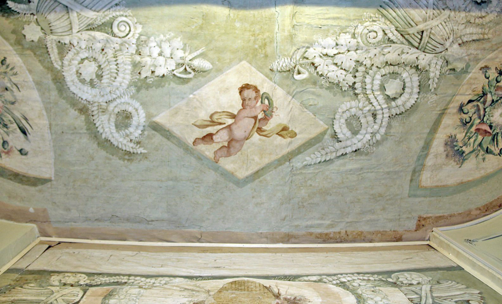 Интерьерная живопись в доме Полибина, выполненная на бумаге. Маленький путти и цветочные композиции.
