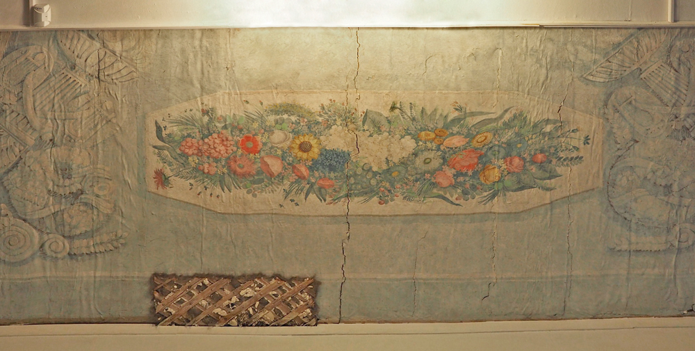 Интерьерная живопись в доме Полибина. Цветочное панно в центре и композиции из арф, вазонов, цветочных венков и корзин по бокам.