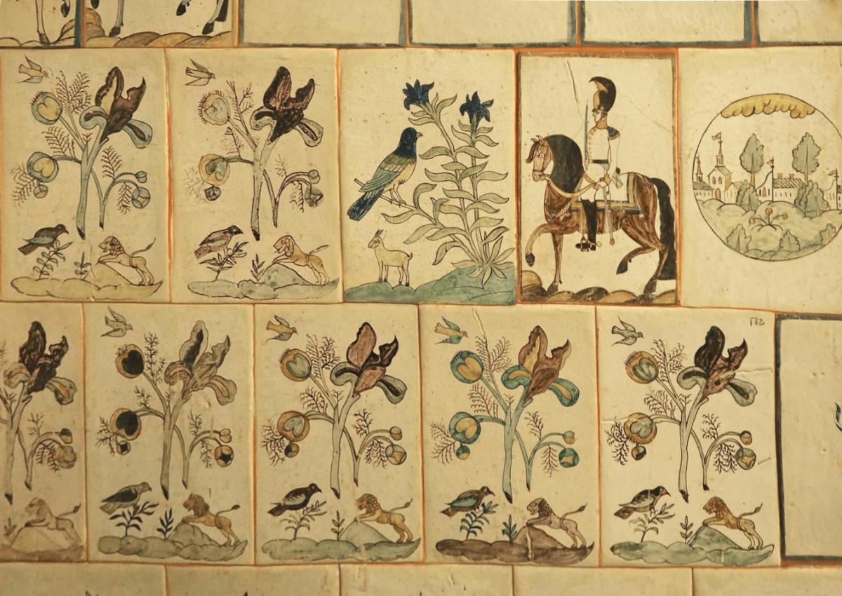 Находка неповрежденного изразца — всегда праздник в работе реставраторов. Его тщательно изучают, зарисовывают, а затем передают на хранение в музей. Находка же целой печи из уникальных по своеобразию изразцов — настоящее событие. По характеру рисунка их можно датировать началом XIX века. Вероятно, они были перенесены сюда с разных печей дома во время перестройки интерьеров в середине прошлого века.