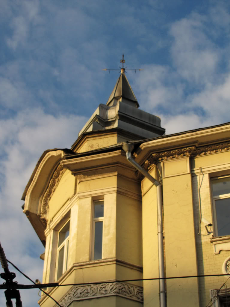 Волхонка, 7 / Ленивка, 6 - доходный дом купцов Лобачевых (1904, арх. Н.Г.Лазарев) с угловым эркером, увенчанным башенкой с флюгером.