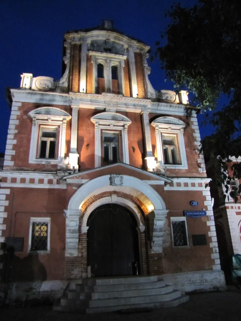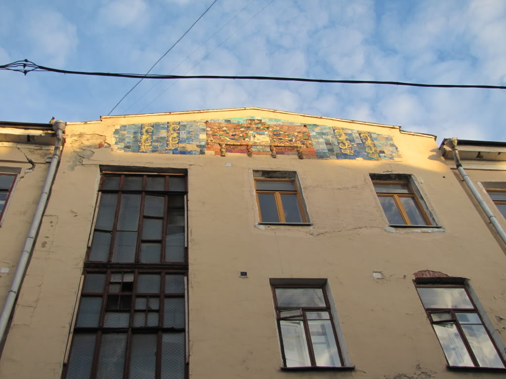 Дом, который находится перед нами - доходный дом П.Г. Солодовникова, он был перестроен архитектором Гончаровым из служебного корпуса находившейся здесь ранее усадьбы. Это один из доходных домов, построенных на средства мультимиллионера Гаврилы Гаврилыча Солодовникова, который почти все свое громадное состояние завещал государству (Петр Гаврилович - его сын - был его душеприказчиком и руководил распоряжением средств пожертвования совместно со специальной комиссией). Майоликовые панно представляют собой несколько картин: какие-то витязи, девушка (якобы это певица Забела - супруга М. Врубеля), рыбки и даже драконы и грифоны. Сведения об авторстве майолик расходятся. Называется А. М. Васнецов. Предполагают, что несколько эскизов принадлежат Врубелю, а также, что Врубель делал все рельефные фигурки композиции. Плитка изготавливалась в Абрамцевских мастерских. Дом, кажется, планируют снести, так что можно считать, нам повезло его увидеть.