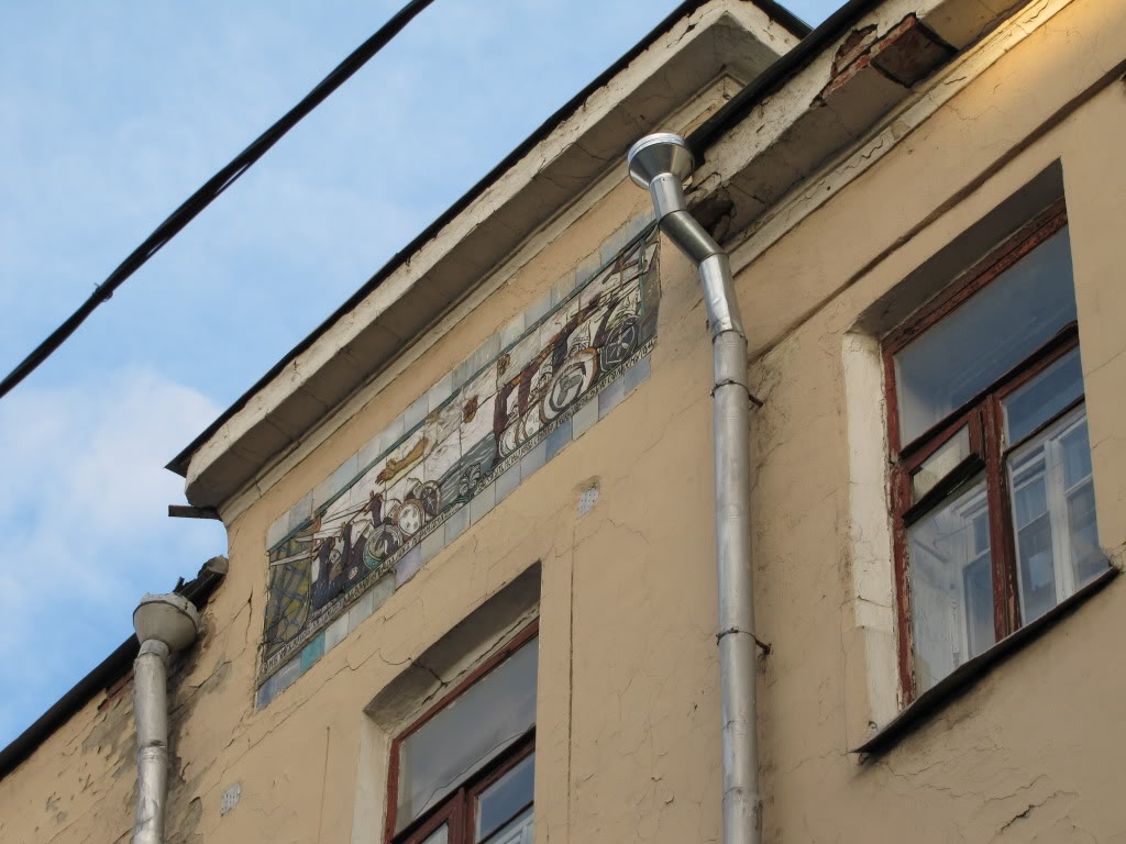 После Ленивки заглядываем в Лебяжий переулок, в начале которого перед нами предстает на первый взгляд совершенно безликий обшарпанный дом, но это только на первый взгляд. Почти под крышей дома сияют в солнечных лучах очень красивые майолики, жаль, что находятся они слишком высоко, чтобы снизу можно было их как следует рассмотреть.