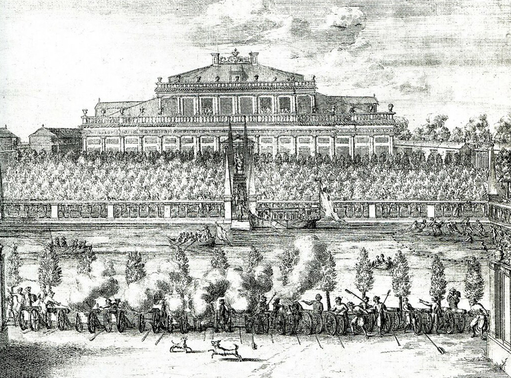 Здесь же в декабре 1702 года в большой зале устроили выступление русских артистов. Удивленные зрители впервые услышали не иноземную, а родную речь. Премьера российского спектакля имела большой успех.